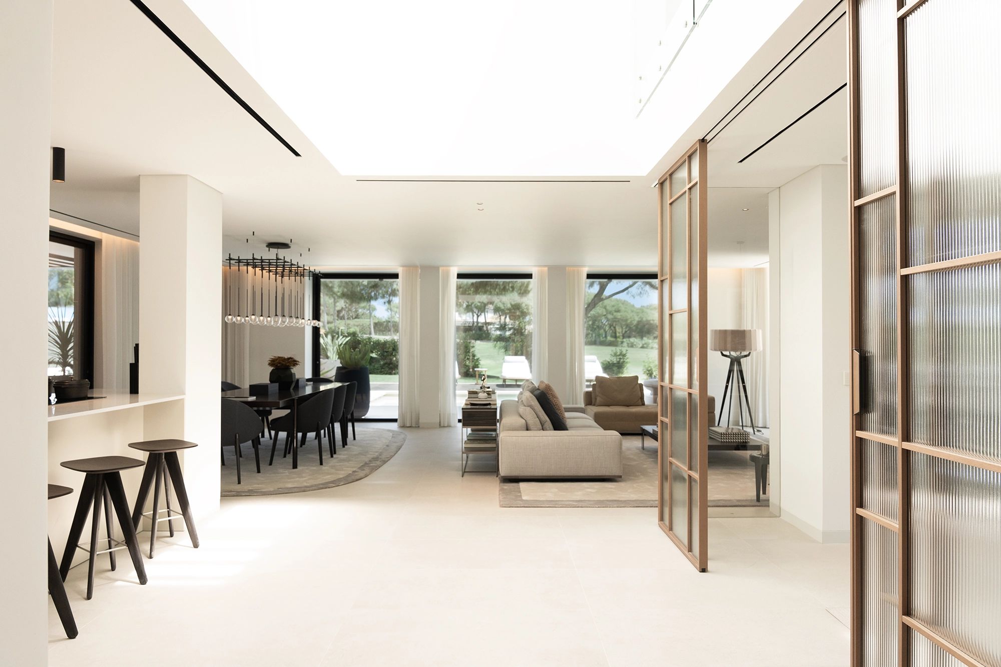 The extensive interiors are excellently outfitted, with private lifts and cinema rooms, providing a welcoming space for family and friends. Plan Architects deep understanding of the region, made them maximize the sun and the views over the golf course, Natural Park, and lake.